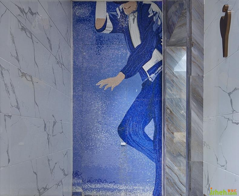 衛(wèi)生間區(qū)域以小顆粒馬賽克拼貼而成的藍(lán)色Jackson為背景墻,讓該停留區(qū)域充滿著爵士舞般的浪漫生活情懷。