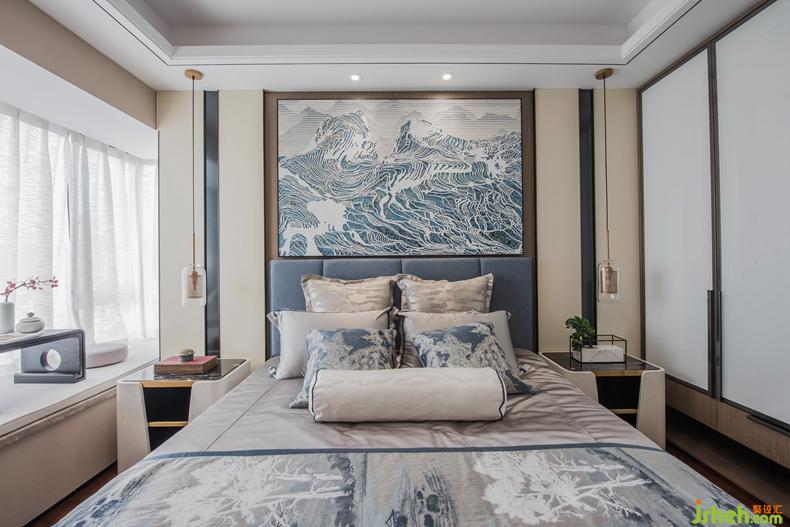 臥室設(shè)計(jì)上,將自然山水的景色引入空間,在現(xiàn)代生活的環(huán)境中結(jié)合東方美學(xué)底蘊(yùn),意在“一卷代山、一勺代水”,令空間居住者自然代入“物象因視覺成景,景因心悟而成境”的無相、萬象空間。