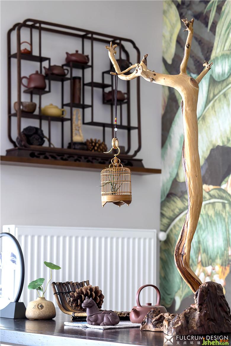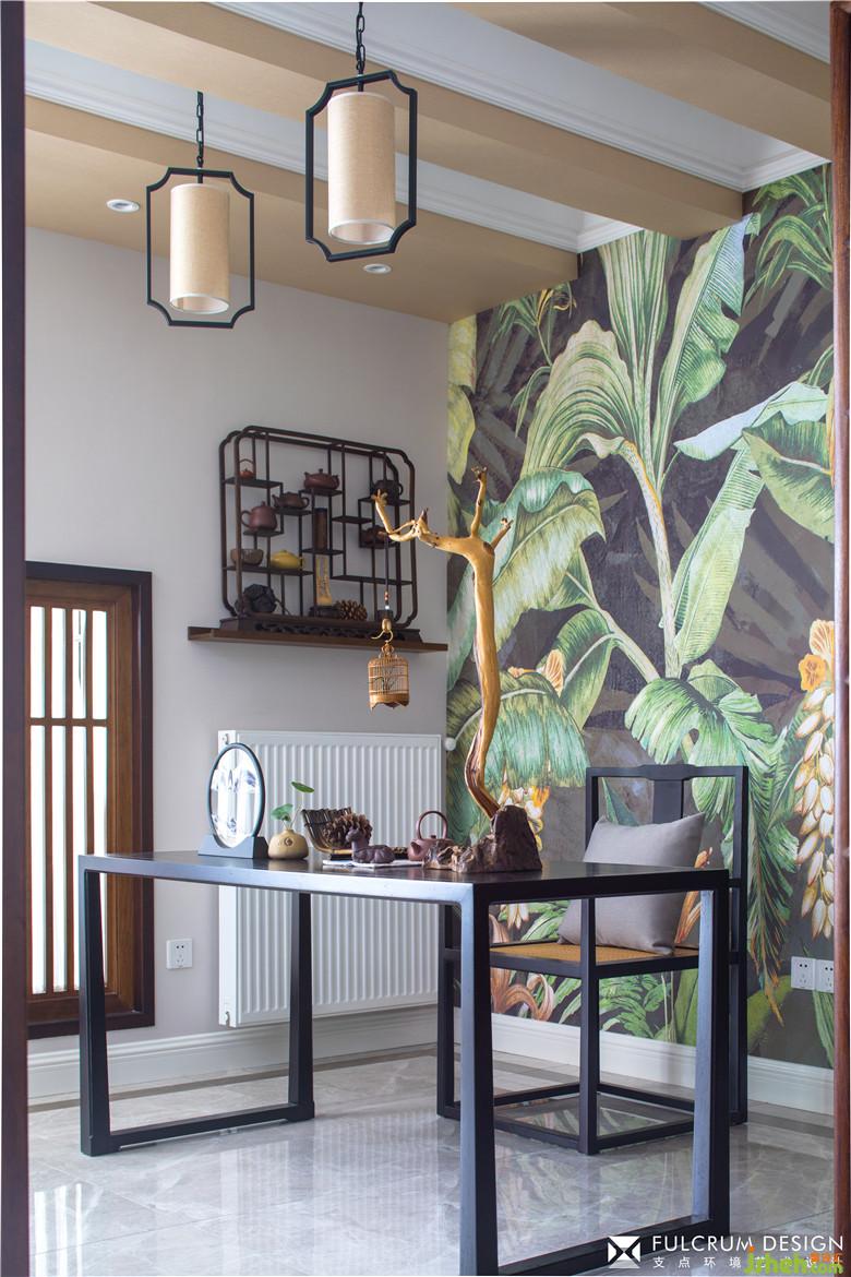 墻面仿佛原始密林的壁畫,室內(nèi)設計師讓原本生硬的單調的茶室變得幽靜,透過稀疏的紗簾和原木隔斷,一縷陽光灑進來,一種怡然自得的感覺油然而生。
