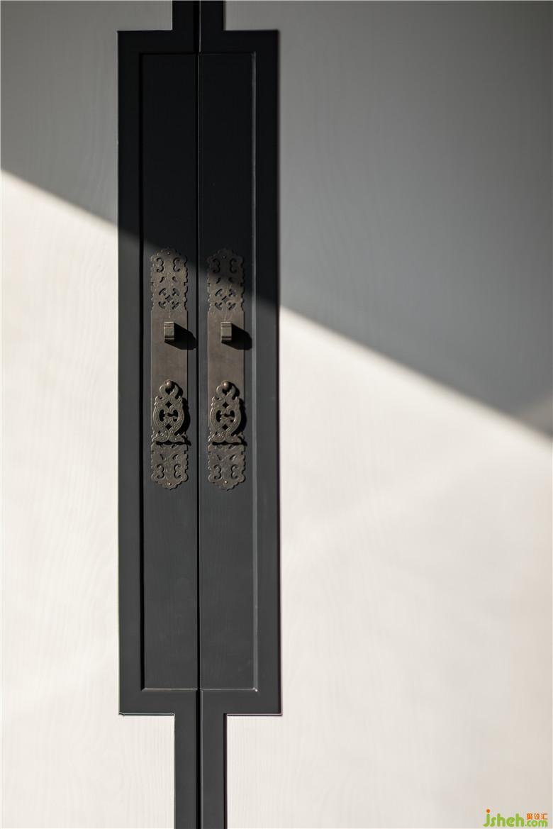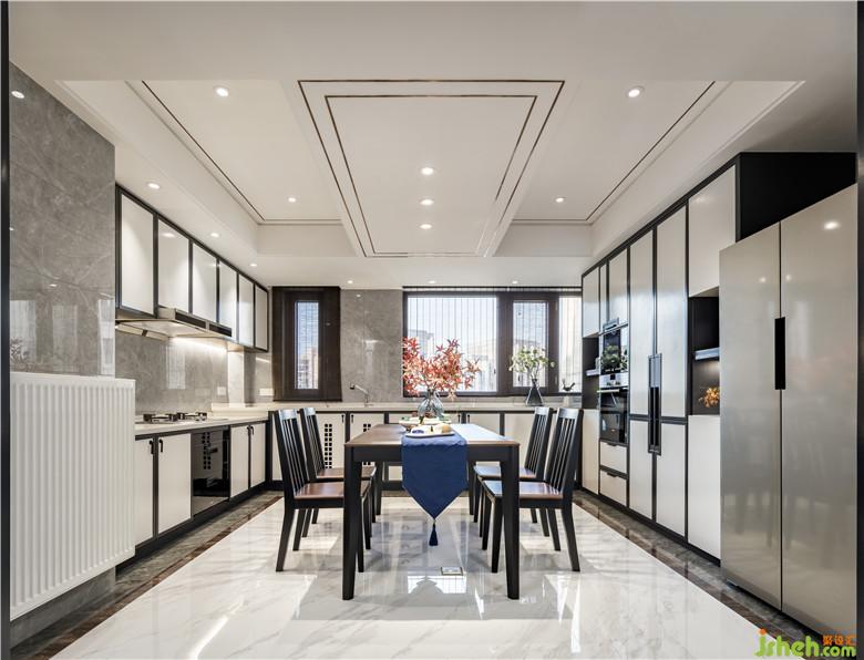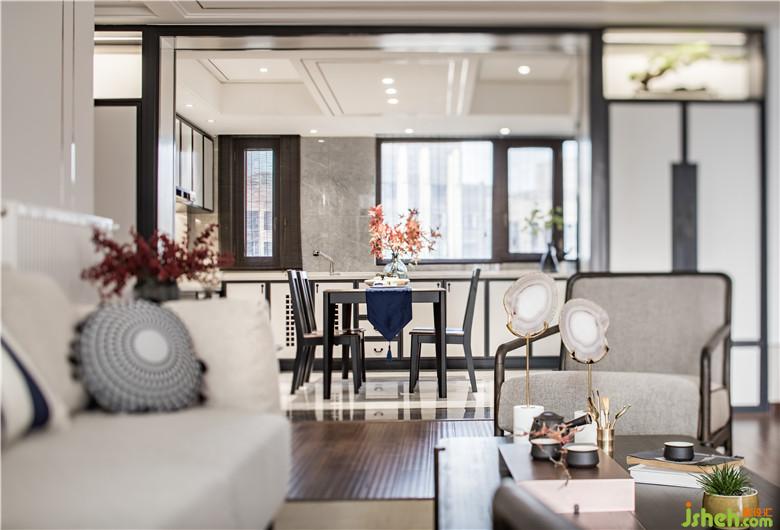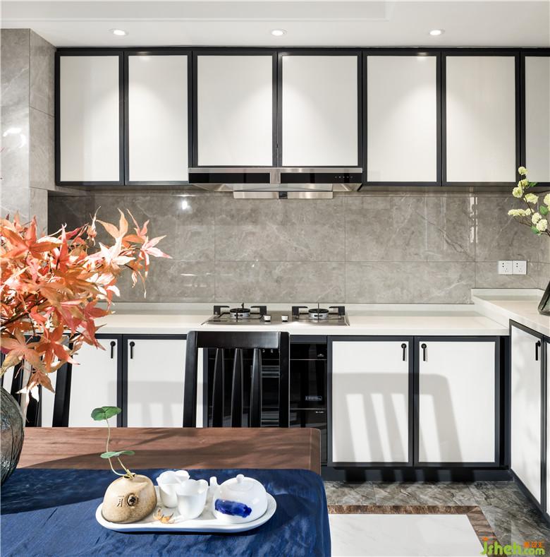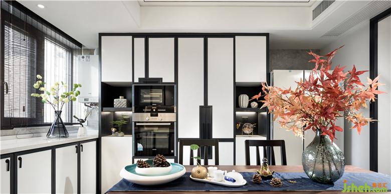 精致的餐廚空間,開放式的空間布局納入更多自然光線?;疑膲Υu襯托下,黑色邊框勾勒的櫥柜滲透著東方韻味,餐桌椅采用黑色木紋與胡桃木組合,室內(nèi)設(shè)計(jì)師細(xì)節(jié)上延用了整個(gè)空間東方現(xiàn)代的元素,在飾品選擇上選用一些隱含中式元素的花器和器皿擺件,在黑白灰的基調(diào)中,淡淡的一抹紅楓,給整個(gè)空間染了色,勾畫出一處和睦歡愉的用餐場(chǎng)所。