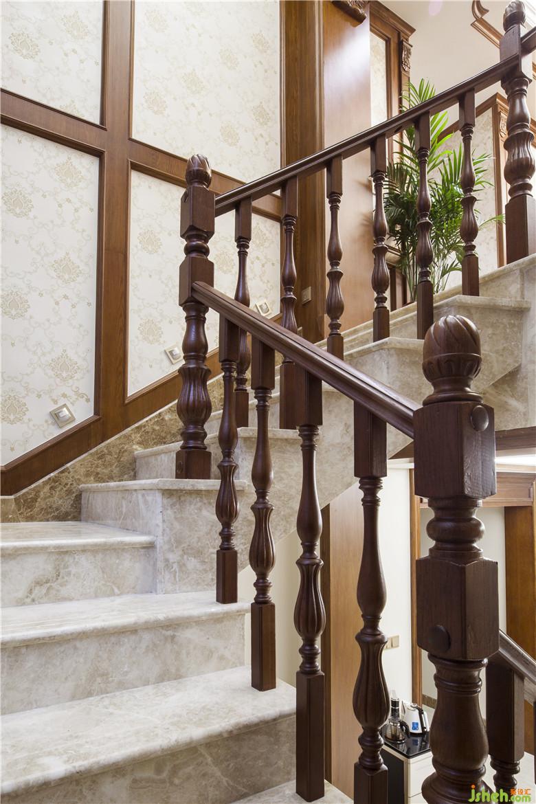 旋轉(zhuǎn)樓梯設(shè)計配合頂面的造型處理尤其大氣,復(fù)古樣式的樓梯欄桿扶手,曲折圓潤而上,將空間劃分得通透而豁達(dá)。