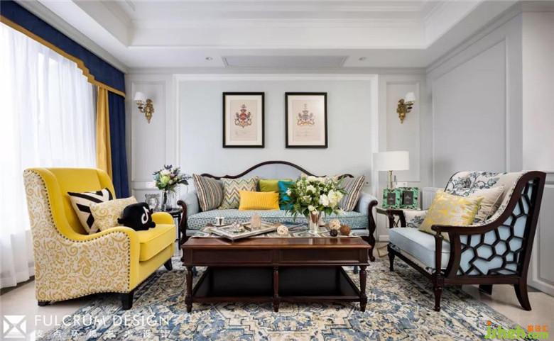 客廳里淺綠的沙發(fā)背面的暗紋墻紙配合淺灰的墻面,顯得清爽淡雅。帶有傳統(tǒng)美式元素的家具,純銀的古董茶杯,帶貴族族徽的裝飾畫跟現(xiàn)代風格的墻面大理石,掛飾相映成趣,給人一種時空穿梭感。