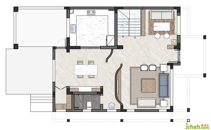 同時(shí)將客廳和餐廳之間用了弧形墻面隔開(kāi),