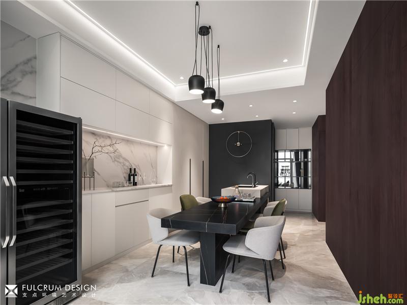 尚系黑色藝術(shù)涂料把衛(wèi)生間外墻涂成黑盒子,與黑色巖板臺(tái)面、形成西廚空間的縱向連接。