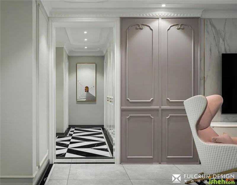 家居裝修應(yīng)客戶要求在過道設(shè)置儲(chǔ)物間,所以內(nèi)推了左側(cè)對(duì)應(yīng)位置的墻面,地面上的黑白拼花磚是設(shè)計(jì)師特地設(shè)計(jì)的拼法,與頂面筒燈位置相呼應(yīng)。