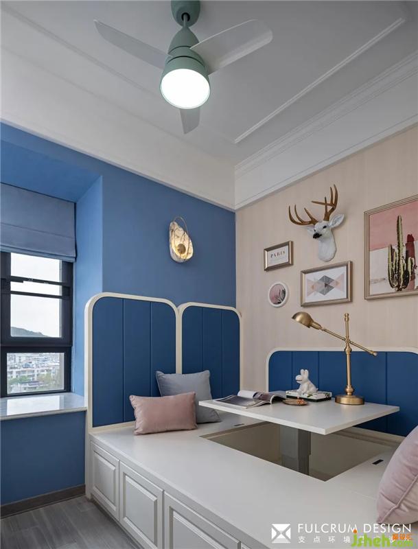 電視背景墻兩邊與沙發(fā)背景墻兩邊用同樣的飾面造型,藍(lán)色有安靜、沉穩(wěn)之感,設(shè)計(jì)師運(yùn)用不同明度、灰度的藍(lán)色在墻面硬裝、家具飾面和飾品擺件,用來中和大量飾品、擺件產(chǎn)生的繁瑣感受,令人產(chǎn)生神清氣爽、心曠神怡之感。