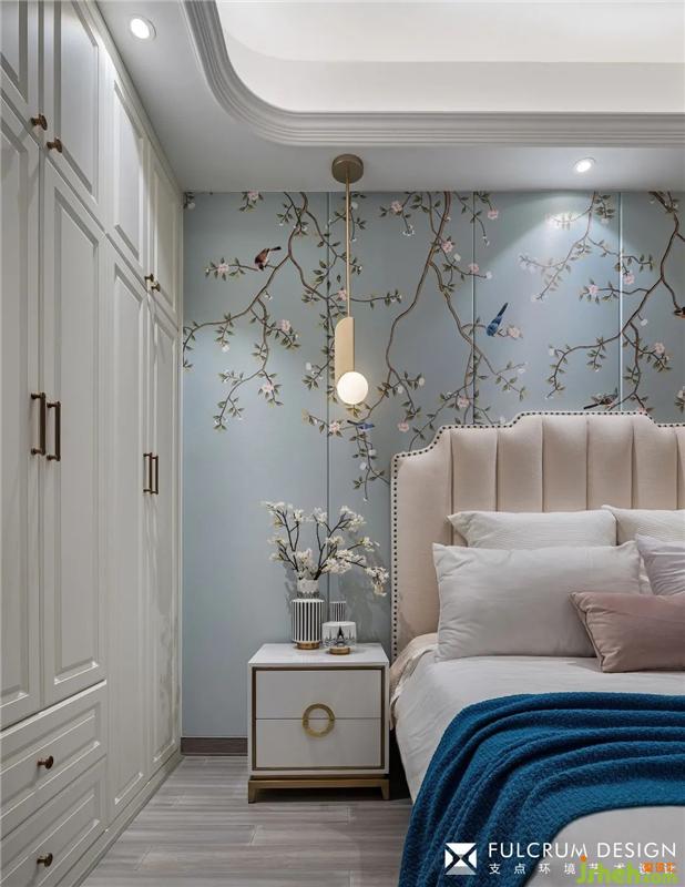 年齡越大的人,越喜歡豐盈、喜慶的東西,設(shè)計(jì)師采用以小見大的手法,家居裝修利用軟裝勾勒一幅“春日花鳥圖”,營造喜悅意境。墻面硬包上的樹枝蜿蜒搖曳、錯(cuò)落有致,床頭柜上的白色海棠花延伸硬包花紋、盛開出來,鳥兒姿態(tài)生動(dòng),場景豐富活潑。