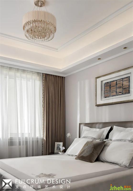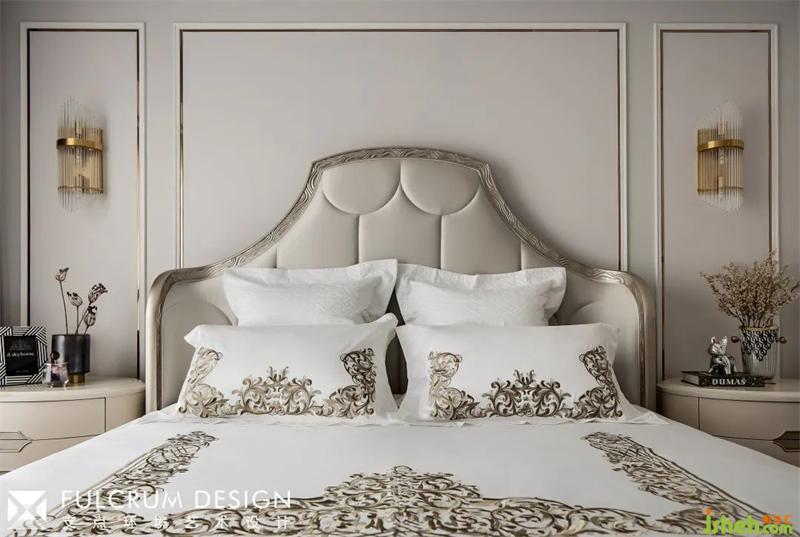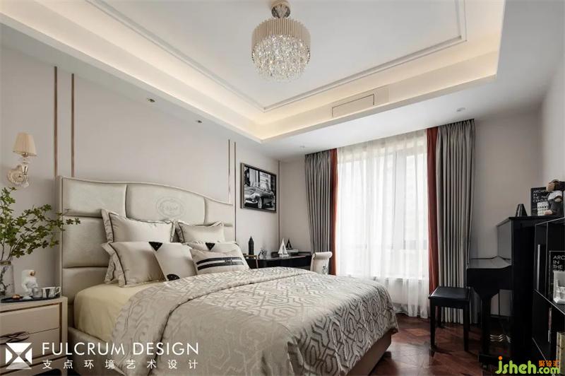 主臥延續(xù)客餐廳浪漫的英式風情,以深色復古木紋地板增添睡眠空間該有的沉穩(wěn)感受,高床軟枕,使睡覺更有儀式感。