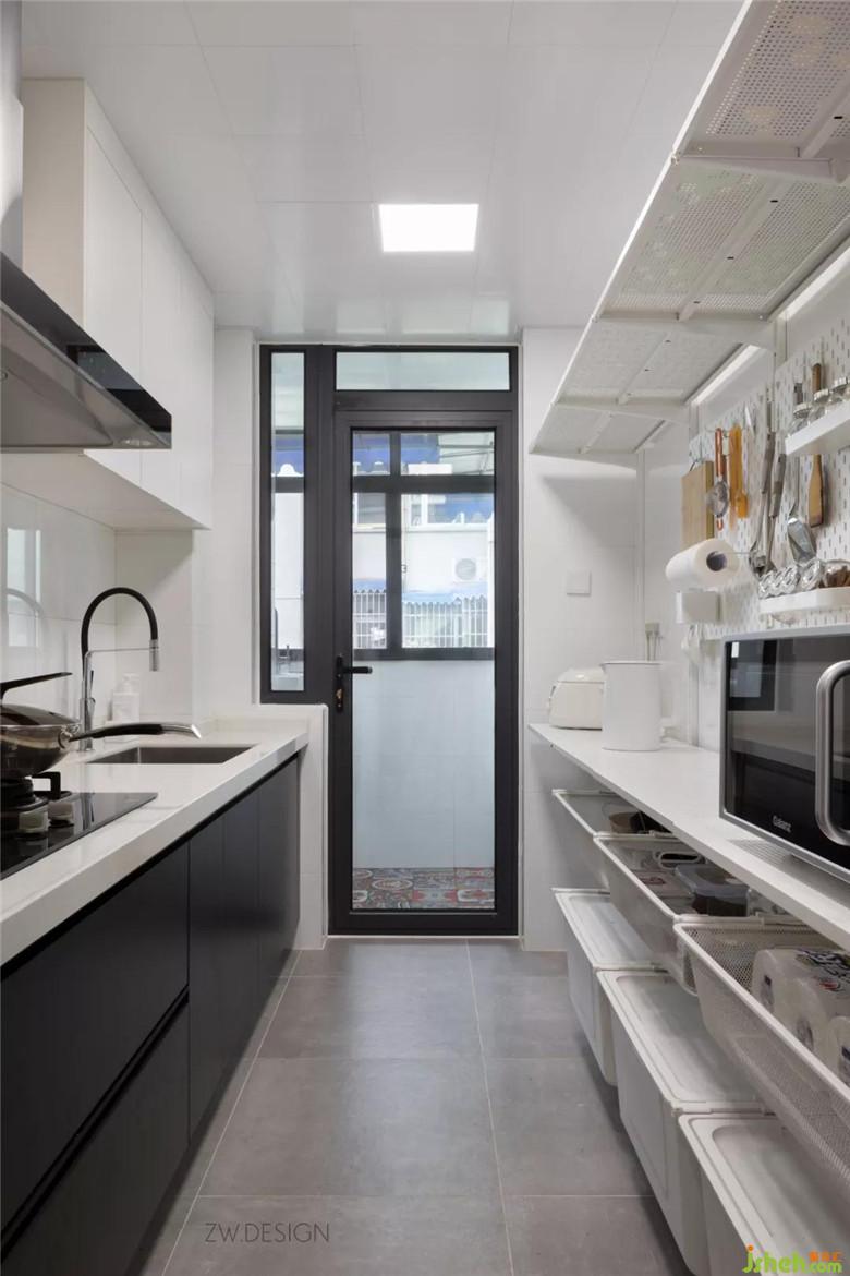 通過門洞位移,將動線往櫥柜一側(cè)移動,釋放出原本浪費的一側(cè)墻面空間,利用這個空間設(shè)計了宜家的艾格特(ALGOT)貨架,補(bǔ)充了廚房操作臺面的同時,增加了巨量的收納空間。相對兩側(cè)櫥柜的設(shè)計,艾格特有更好的靈活性、實用性和更高的性價比。次臥壁櫥也采用了艾格特貨架,屋主準(zhǔn)備之后次臥先用來養(yǎng)狗狗,所以暫時空閑沒有拍照。廚房和生活陽臺墻面都采用了純白色瓷磚,盡可能多的將自然光線引入室內(nèi)。致物設(shè)計