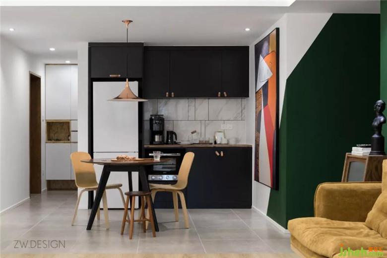 通過地面材質(zhì)的區(qū)分,把通道的面積也劃給了餐廳,餐廳顯得大了許多。在墻體陽角做了斜切的分色,與巨幅抽象畫相得益彰,墨綠色乳膠漆與抽象畫的搭配帶來強(qiáng)烈視覺沖擊。