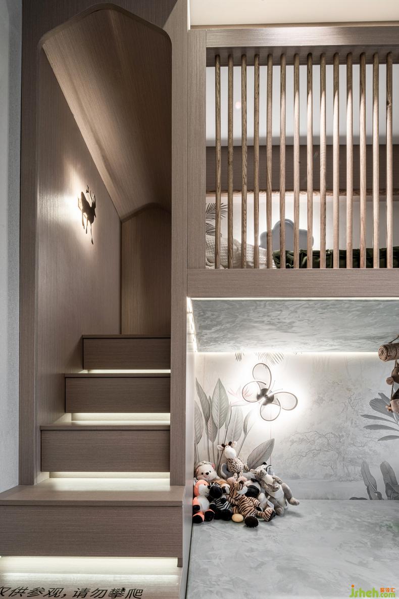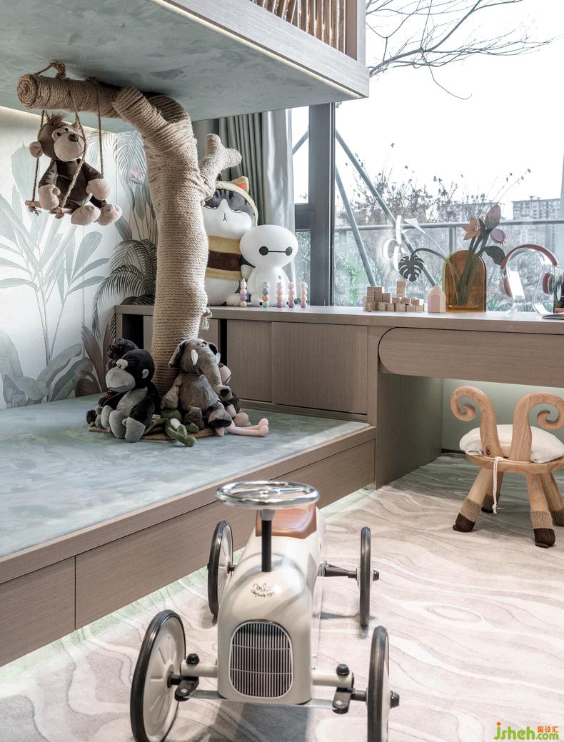 森林王國小王子臥室,結(jié)合了“樹屋”元素,運用樹林空間主題讓小王子置于森林,天花和墻面的定制主題墻紙貫通,在空間層上做立體構(gòu)成,在不同高度的空間里面探索森林的故事,體現(xiàn)男孩子的探索求知欲,樣板房設(shè)計在叢林中不斷發(fā)現(xiàn)不斷學(xué)習(xí),極具想象力的獨特表現(xiàn)手法,帶給新鮮的藝術(shù)體驗感和故事性,吊籠床充分利用了空間,形成天地墻的延續(xù)性,在吊籠床里,仿佛是孩子的搖籃,也可以通過吊籠床的窗戶立起望遠(yuǎn)鏡遙望外面的景觀,燈光方面,從而在不同的空間界面上構(gòu)筑成交錯的光影和變化。而下方休息區(qū)放置了秋千,讓小王子玩累了仿佛在森林里休息一樣。緊靠休息區(qū),延伸窗戶同等寬度的是學(xué)習(xí)區(qū),樣板房設(shè)計考慮到兒童的學(xué)習(xí)周期而設(shè)的充分臺面尺寸,也體現(xiàn)其學(xué)習(xí)樂趣,具有動靜結(jié)合的一面。
