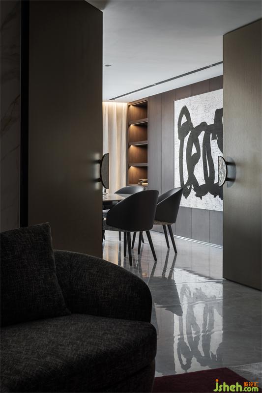 品酒區(qū),透明的酒柜與舒適的家具遙相呼應,呈現(xiàn)適合摯友輕松交談的愉悅氛圍。穿過品酒區(qū)進入餐廳,餐廳與露臺連接,明亮的光線使整體視野通透無比?,F(xiàn)代的藝術書法令人眼前一亮,打破了木色的深沉基調。