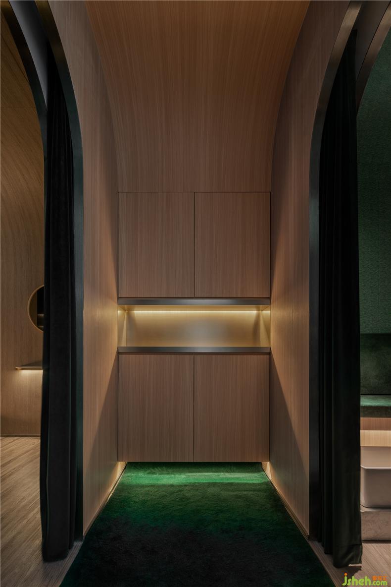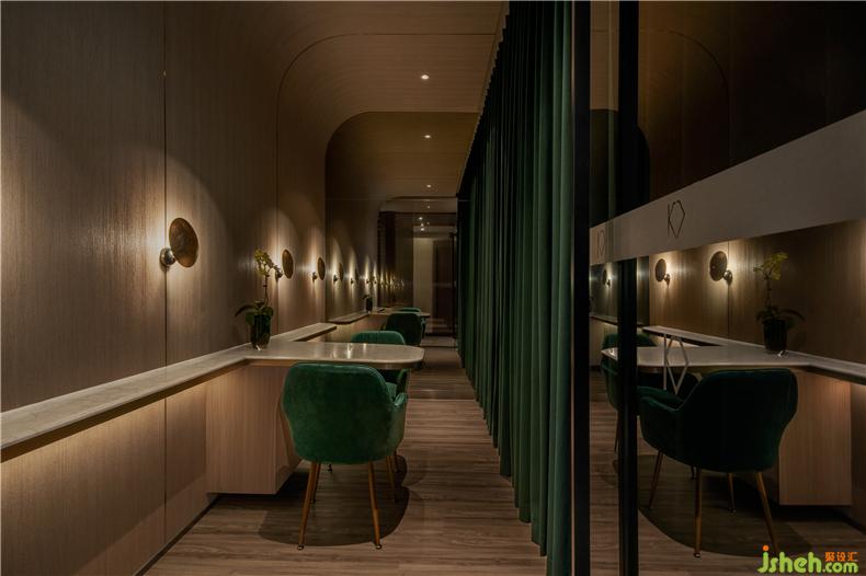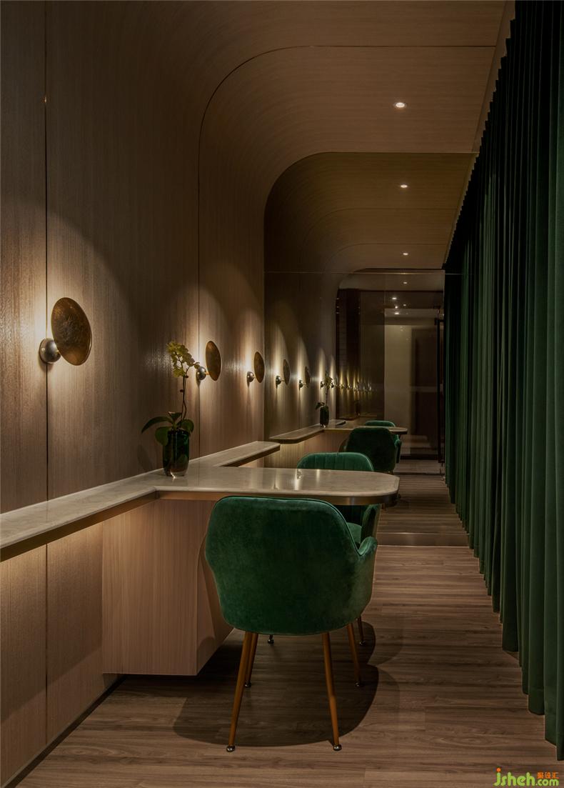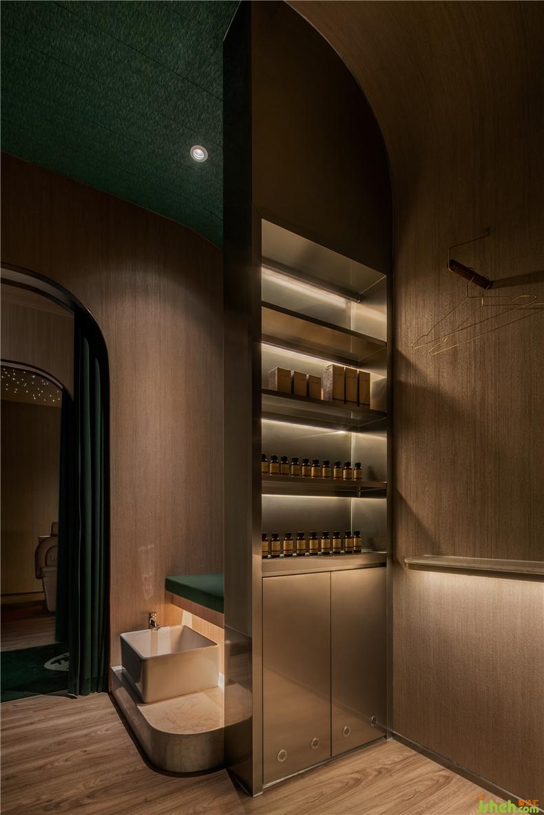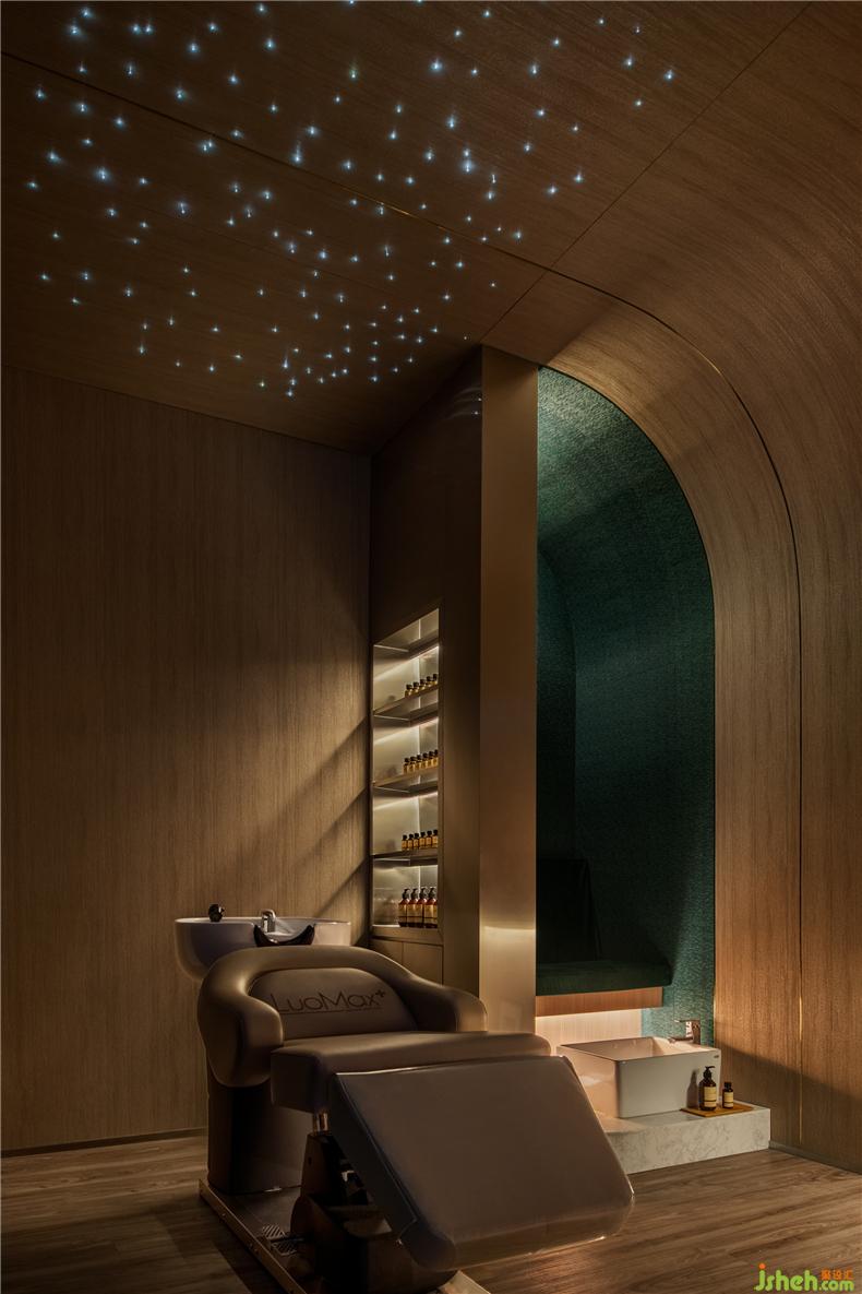設(shè)計師堅信愉快的消費體驗來自無微不至的細節(jié):咨詢室以列車餐車為設(shè)計靈感,如同兩三摯友暢談聊天,打破了零售空間中常見的買賣對立的關(guān)系,其中氛圍,好似列車經(jīng)過隧道,車廂亮著壁燈的溫暖場景;而展示產(chǎn)品的壁龕,也以列車中餐車的形式展現(xiàn)。進入護理區(qū)域,浴足座位再現(xiàn)軟臥包廂的感覺,天花則處理成半弧形,當客人護理時,躺臥于沙發(fā)座椅上,室內(nèi)設(shè)計師視線接觸比較多的天花,所見是若明若暗的星空。