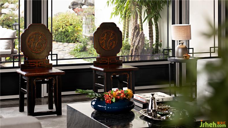 客廳中的兩張座椅,是清代道光年間的古董家具,大漆工藝歷經(jīng)歲月散發(fā)出不可思議的美感,設計師在國外發(fā)現(xiàn)這一對座凳時欣喜不已。