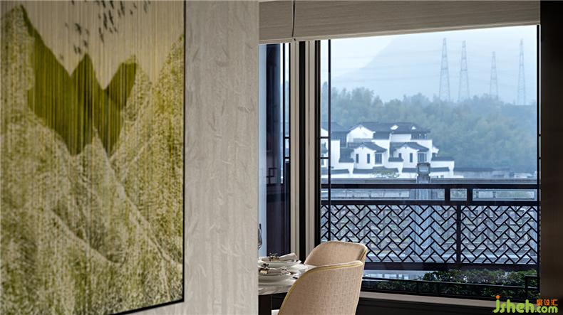 客廳中青山藝術(shù)畫充分表達(dá)平靜自在的心境,“峽里誰知有人事,世中遙望空云山?!睆目蛷d的落地窗向遠(yuǎn)處眺望,天空澄碧、纖云不染,遠(yuǎn)山含黛、和風(fēng)送暖。畫與景融為一體、美輪美奐。