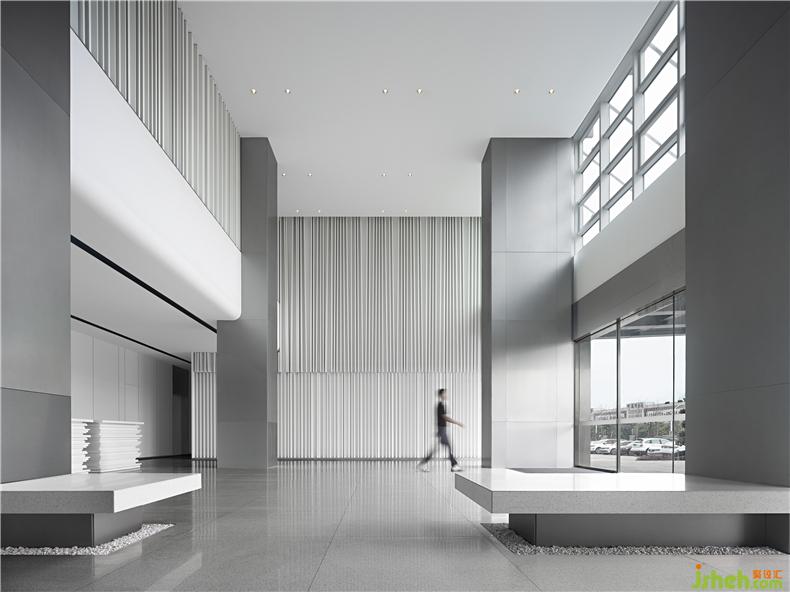 在空間布局上,WED中熙設(shè)計對原來上下兩層的大堂建筑空間的結(jié)構(gòu)進(jìn)行重新設(shè)計,對人流動線也重新規(guī)劃。原有空間中大堂中四根立柱孤立存在,連接橫梁阻礙視線破壞空間整體感,與外立面也毫無聯(lián)系,辦公室設(shè)計設(shè)計師重新調(diào)整了幾者的關(guān)系,把四根柱子鏈接做成整體的構(gòu)筑物,也創(chuàng)造出人員行走和等待的不同動線。