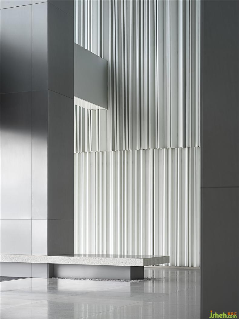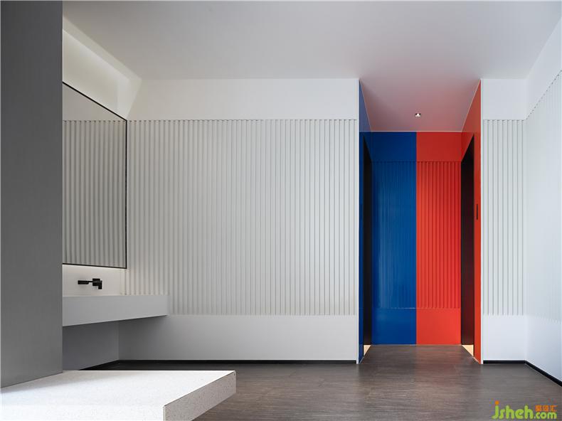 The application of colors is undoubtedly another outstanding feature of the space. The designer of bathroom distinguished the male and female areas through strong color contrast of blue and red by combining the basic colors of the brand. Such method enriched visual impact and offered a touch of art to the gray space focusing on efficiency.