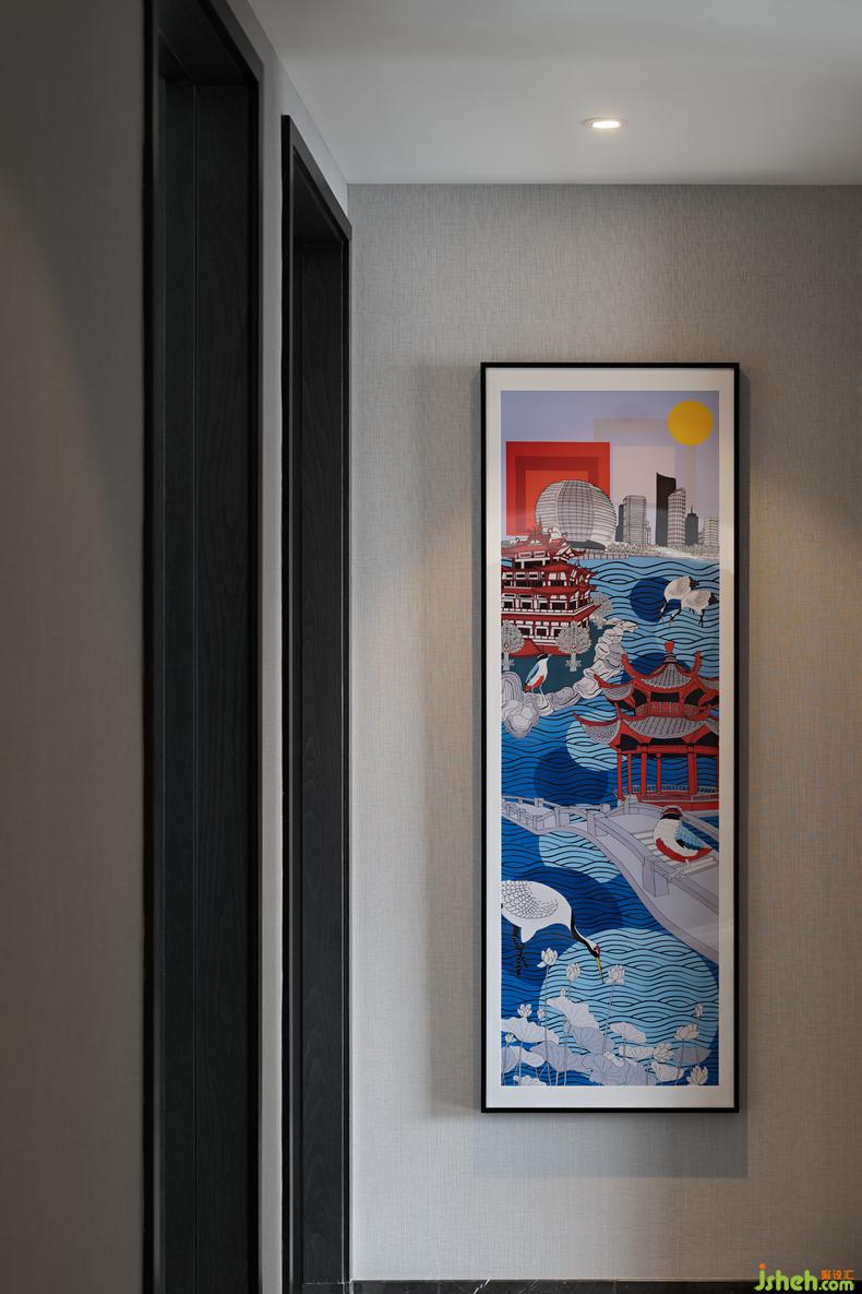走廊盡頭處特意選擇英國藝術家Rob Pepper的《A Portrait of Hangzhou杭州印象》,以獨特的視角,大膽、優(yōu)雅的筆觸呈現一個獨一無二的杭州印象。臥室則是中國藝術家田丹露的《曙色遠連山色起》,樣板房設計以幻點色彩的藝術手法詮釋一個霧雨朦朧的感覺空間,感受空間中帶來的平和寧靜與治愈身心時的沉醉。
