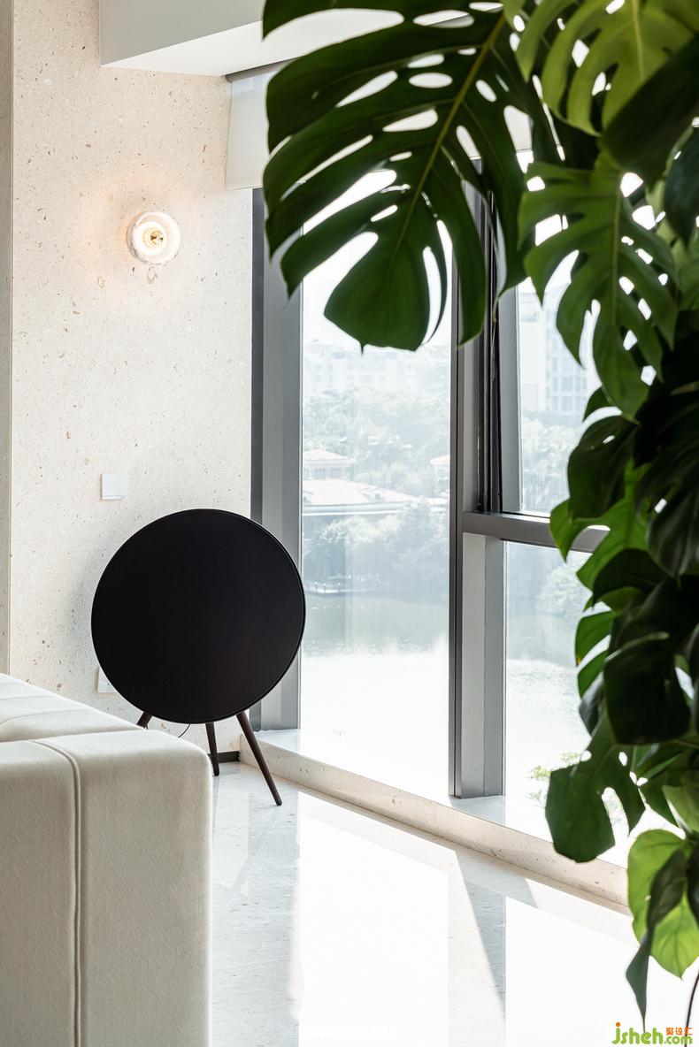 在客廳看似平常的墻面藏著設(shè)計(jì)師的巧思,豪宅設(shè)計(jì)需要遙控器打開(kāi)隱藏在墻后的電視機(jī),與沙發(fā)后面的單立音響是一整套BOSE家庭立體影院,以及聽(tīng)音樂(lè)專(zhuān)寵丹麥頂級(jí)音響品牌B&O,這是屬于李先生喜歡音樂(lè)、喜歡收藏音響的生活情調(diào)。
