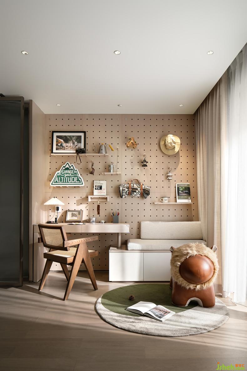 新潮的成都年輕人喜歡戶外露營這一親近自然的方式,樣板房設(shè)計(jì)從而收獲探索與發(fā)現(xiàn)的豐富體驗(yàn)。因此室內(nèi)設(shè)計(jì)通過洞洞板展示精心布置的戶外用品墻,與客廳處山川森林風(fēng)景旅行的攝影墻相互映襯,創(chuàng)造一種充滿樂趣、慷慨和冒險(xiǎn)的生活氛圍。