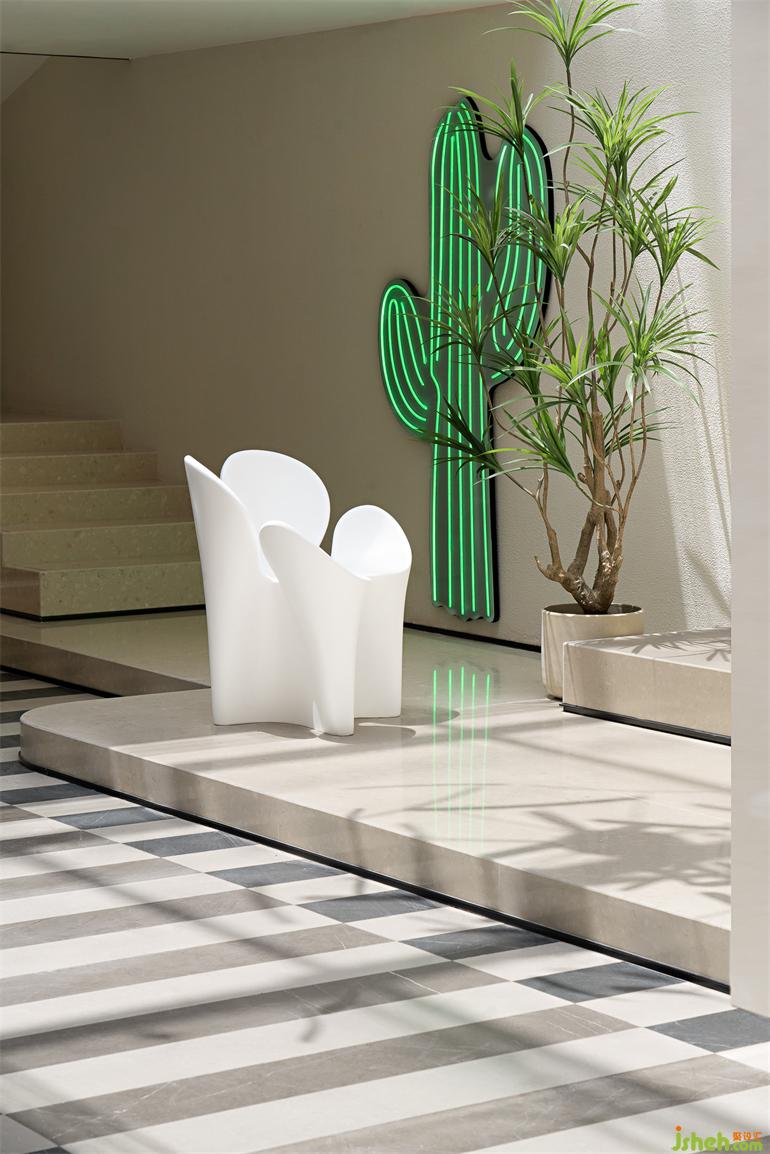 年輕一代的生活方式在仙人掌霓虹中落座,現(xiàn)代藝術(shù)的“反叛”契合自然的光影、繁茂的綠植、造型獨(dú)特的木墩、白色的CLover chair,生活美學(xué)館設(shè)計(jì)在盎然生機(jī)中兼納都市潮流的動(dòng)與靜,達(dá)以藝術(shù)與自然的平衡。