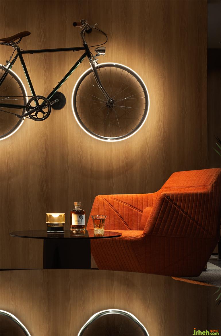 由復(fù)古自行車改造而成的墻面燈具,生活美學(xué)館設(shè)計(jì)以視覺藝術(shù)的張力模糊著空間與感知、時(shí)間與現(xiàn)實(shí),造型獨(dú)特的落地?zé)粼邳c(diǎn)亮空間的同時(shí),文雅中不失活躍趣味和沉思的神秘感,為生活靈感續(xù)杯。
