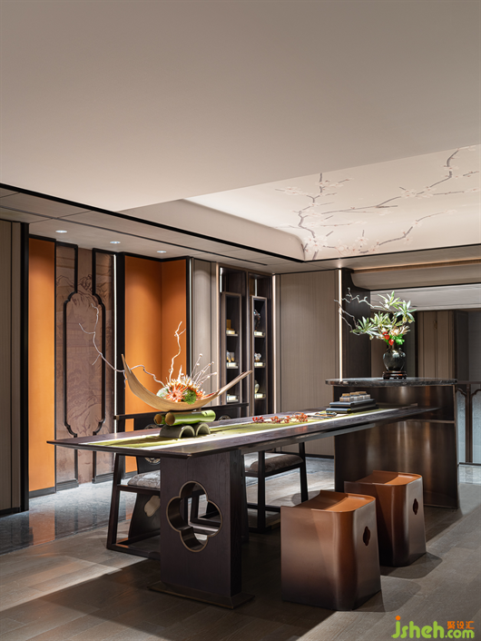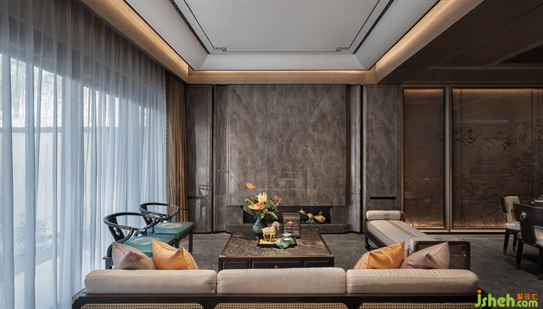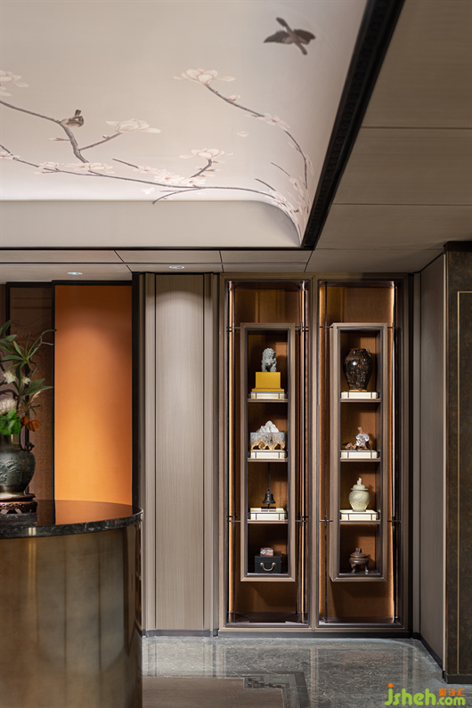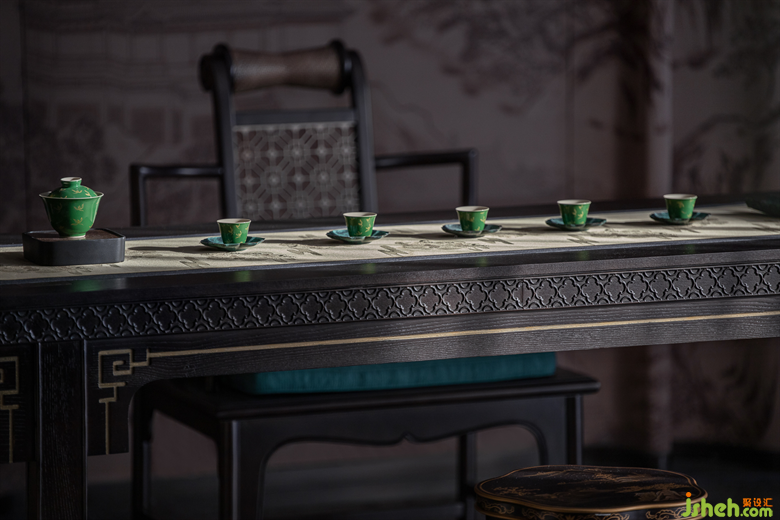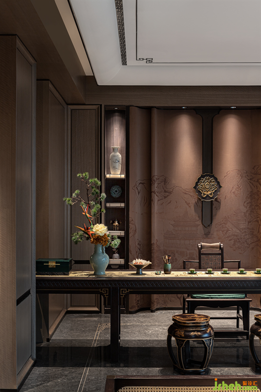 青綠,從《千里江山圖》中走來(lái),在畫中靜待千年,歷經(jīng)千年而未衰,即使在幽暗的環(huán)境中依然泛著寶石的光芒。別墅樣板房設(shè)計(jì)一層的會(huì)客空間,色調(diào)沉靜古樸,墻面的山水畫卷大氣磅礴,彰顯著主人心有丘壑、眼存山河的胸懷與氣度。而點(diǎn)綴其間的青綠是才是整個(gè)空間的靈魂,它才是生命力最強(qiáng)的,就像明月一樣,存在千年。