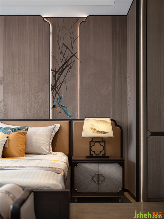 從電梯上至二樓,別墅樣板房設(shè)計映入眼簾的是三幅采用實木雕花工藝的中式元素掛畫,一步一景,穿過走廊,步入至次臥室空間,輕紗一般的陽光穿過碩大的落地窗灑入屋內(nèi)時。深灰色與艾綠、沙石黃的邂逅,磅礴壯美,疏密有度,遠近濃淡如煙波浩淼兼水草豐茂的江湖,不落俗套。