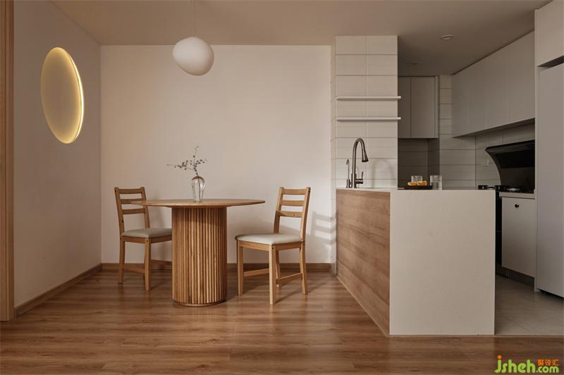 廚房增加圓洞造型墻,加上燈帶營造餐廳溫暖氛圍感,暖白鵝卵石造型吊燈與圓桌呼應(yīng),盡顯日式風(fēng)的簡潔與淡雅。