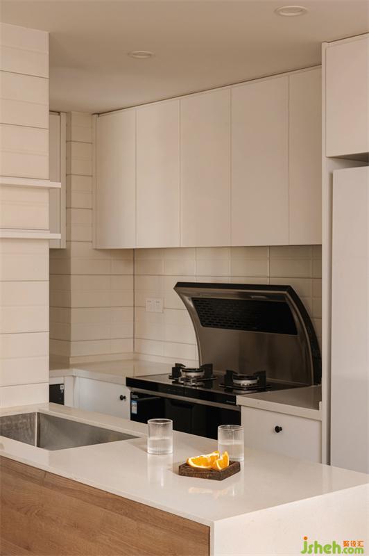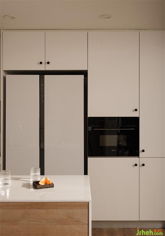 改變原有布局,考慮到只有兩人居住的情況,犧牲一個衛(wèi)生間換來寬闊的餐廚空間。廚房與餐廳之間設(shè)置導(dǎo)臺,增加了兩個空間的互動性,增進家人間的日常溝通。而且兩者開放設(shè)計,整體也會顯得更加開闊通透。