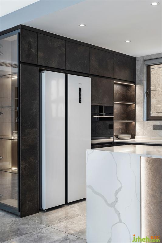 廚房巧妙利用空間設置酒柜,玻璃柜門,朦朧燈光,平添高級感。島臺通過設計比例構成而定制。