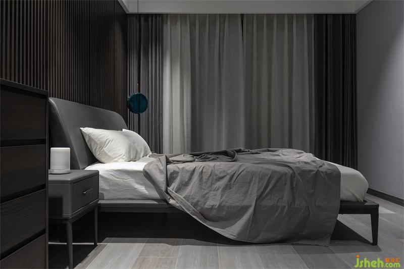 主臥房內(nèi)暗階色調(diào),渲染安穩(wěn)的氣氛空間;床頭用波浪板飾面造型,靈動有序,讓整個安靜的空間動起來。