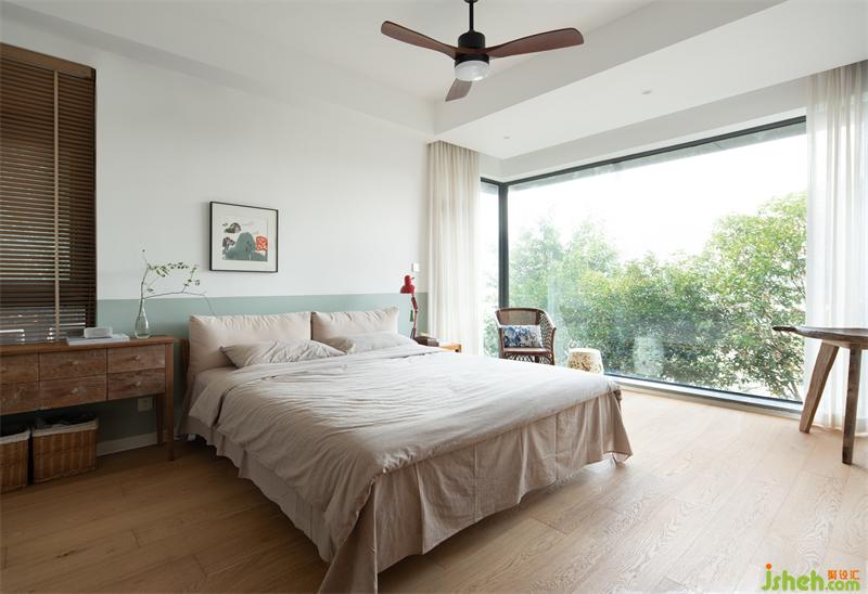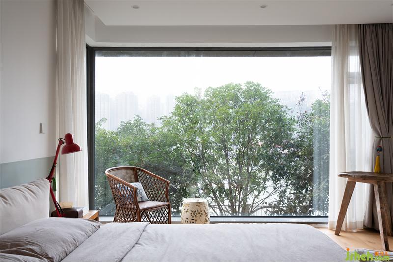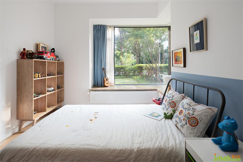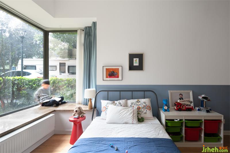 兒子房有一面難得的轉(zhuǎn)角窗,陽(yáng)光充沛,小朋友喜歡面對(duì)花園,坐在飄窗上看書,玩耍,設(shè)計(jì)師特意在窗前種了一株紅楓樹,既可以遮蔽隱私,還可以看到一年四季的樹葉,由綠變黃,轉(zhuǎn)紅,再到落葉的唯美變化;床頭的畫,分別是土耳其和中國(guó)小眾藝術(shù)家的原創(chuàng)作品。
