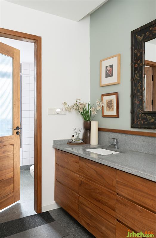 公衛(wèi)的設(shè)計(jì)簡(jiǎn)單干凈,淋浴區(qū)只用一段小墻隔離,暗藏浴簾,方便簡(jiǎn)練;洗臉區(qū)的超長(zhǎng)浴室柜儲(chǔ)納充足,使用方便;古董手繪鏡子和日本原作版畫,現(xiàn)代攝影小品的組合,使得這個(gè)常用的功能區(qū)別有風(fēng)情。