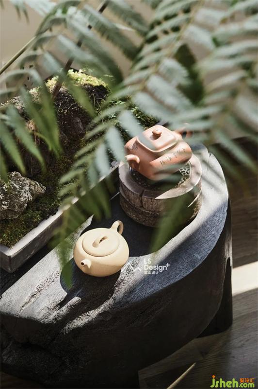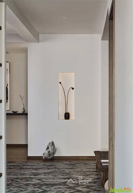 屋主淘來的古玩、太湖石、石墩,“借山引水”般地將凸顯自然的物件引入空間之中,點(diǎn)綴中凸顯與主人相匹配的氣質(zhì)。
