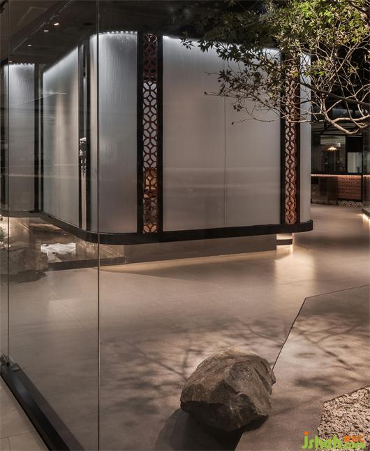 傳統(tǒng)閩南建筑匠人在建造房屋時(shí)很注重因地制宜、就地取材,圍護(hù)結(jié)構(gòu)以紅磚、花崗巖為主,閩南餐廳設(shè)計(jì)構(gòu)成了鮮明的紅磚文化以及石雕文化。本案空間里的紅磚花格、石雕、巖石、器物作品等裝飾構(gòu)件,都在以空間視覺信息生成人文美學(xué)空間,亦增添空間的閩南文化底蘊(yùn)與觀賞性。