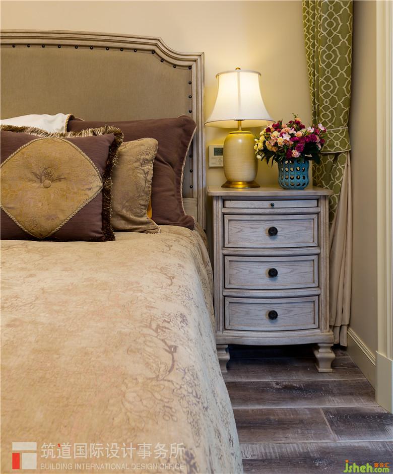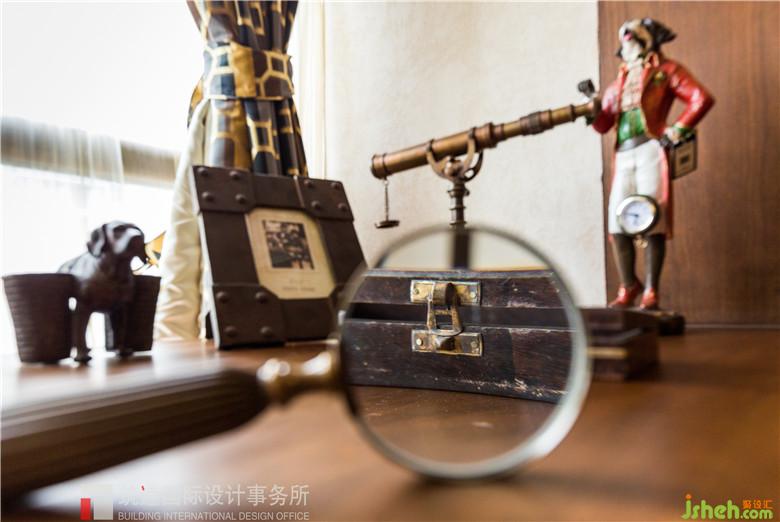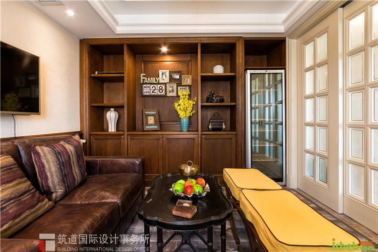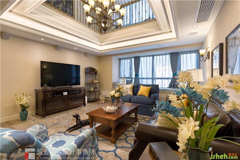 空間色調(diào)以大地色為基礎(chǔ),營造了家的溫馨的基調(diào)。軟裝以深淺藍(lán)色幾何圖案沙發(fā)和地毯搭配明黃色抱枕,再佐以經(jīng)典美式風(fēng)格的咖色真皮沙發(fā)及做舊實(shí)木家具,顏色對比明亮活躍,讓整體空間充滿美式風(fēng)格又不失活力。