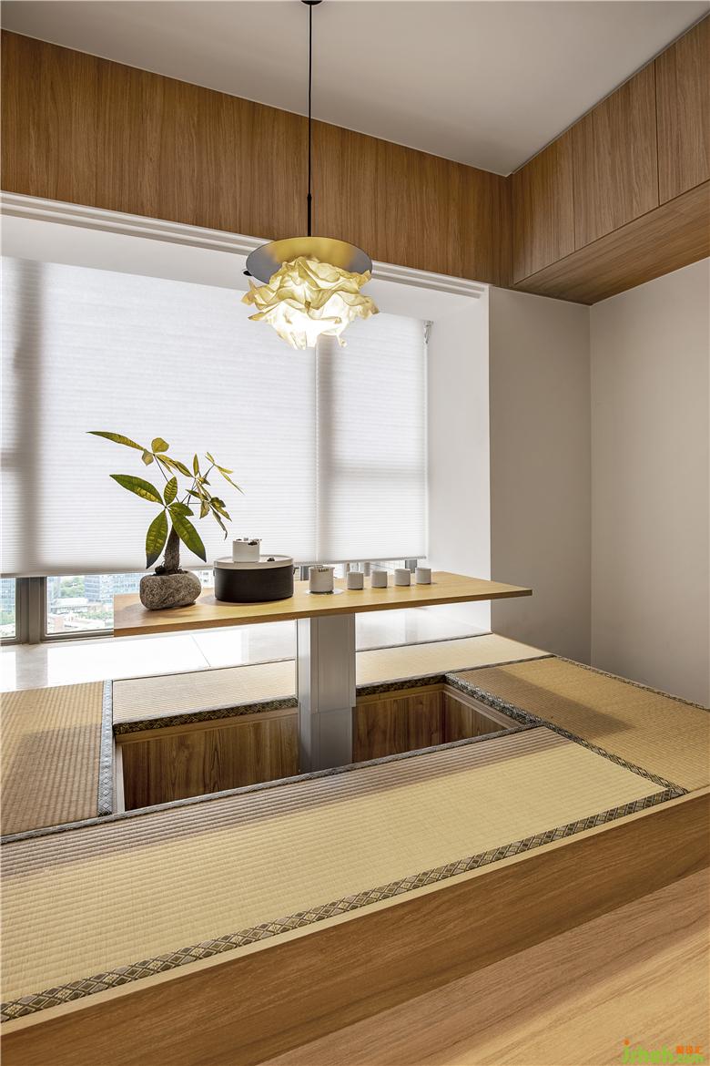 設(shè)計(jì)師在純凈的木色空間中,降低了裝飾性的干擾,“一輪明月”位于空間中央,方中帶圓,光影之中點(diǎn)綴一株植物,布局的素雅與木質(zhì)的溫潤(rùn)給人一種寧?kù)o溫馨。