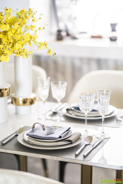 開放的客餐廳、廚房,空間更寬敞明亮,動(dòng)性亦更流暢。山水抽象畫,流動(dòng)的靈性,使空間更具層次及藝術(shù)格調(diào)。晶瑩剔透的水晶燈,精致的餐具擺飾,經(jīng)典時(shí)尚的格紋,無一不在宣示品質(zhì)的生活追求。此外,花飾朝氣蓬勃,樣板房設(shè)計(jì)不僅滿足女主的喜好,亦為空間注入自然活力。