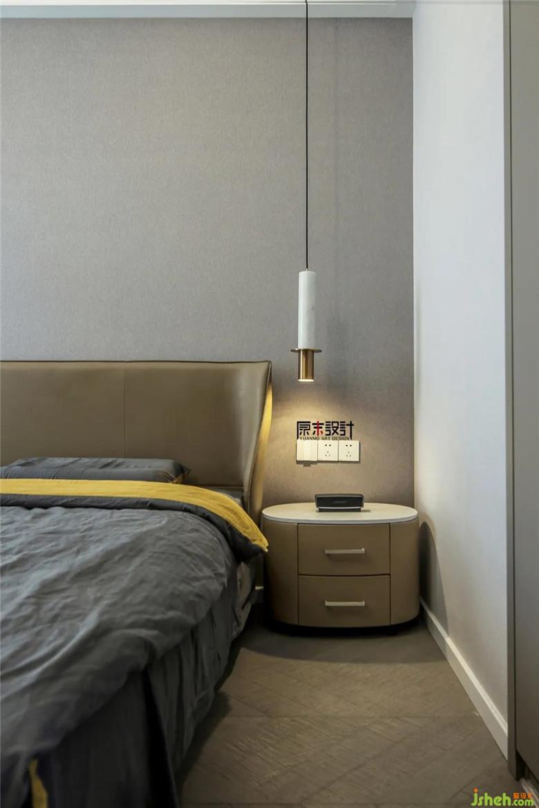 ▲ 被黑白灰圍裹,足夠安全,用質感打破空間沉悶,自在呼吸。臥室主背景的中灰色墻布,與其他墻面的淺灰色進行了良好的呼應與過渡,裝修公司在搭配上現(xiàn)代感十足的床品和吊燈,整體空間氛圍簡約而不簡單。