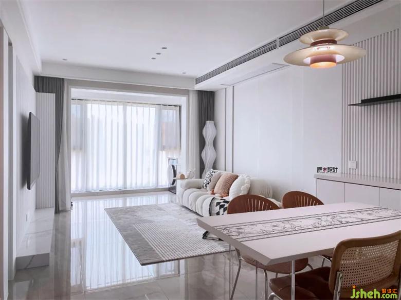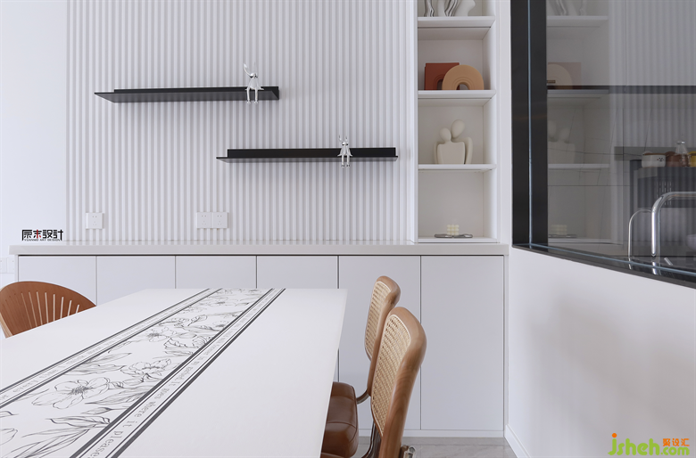 ▲ 白色層次的墻板,搭配房屋中的軟配,圓潤感十足的家居使原本生硬的空間變得柔和了許多,家裝設計增強了客餐廳整體的視覺通透性。