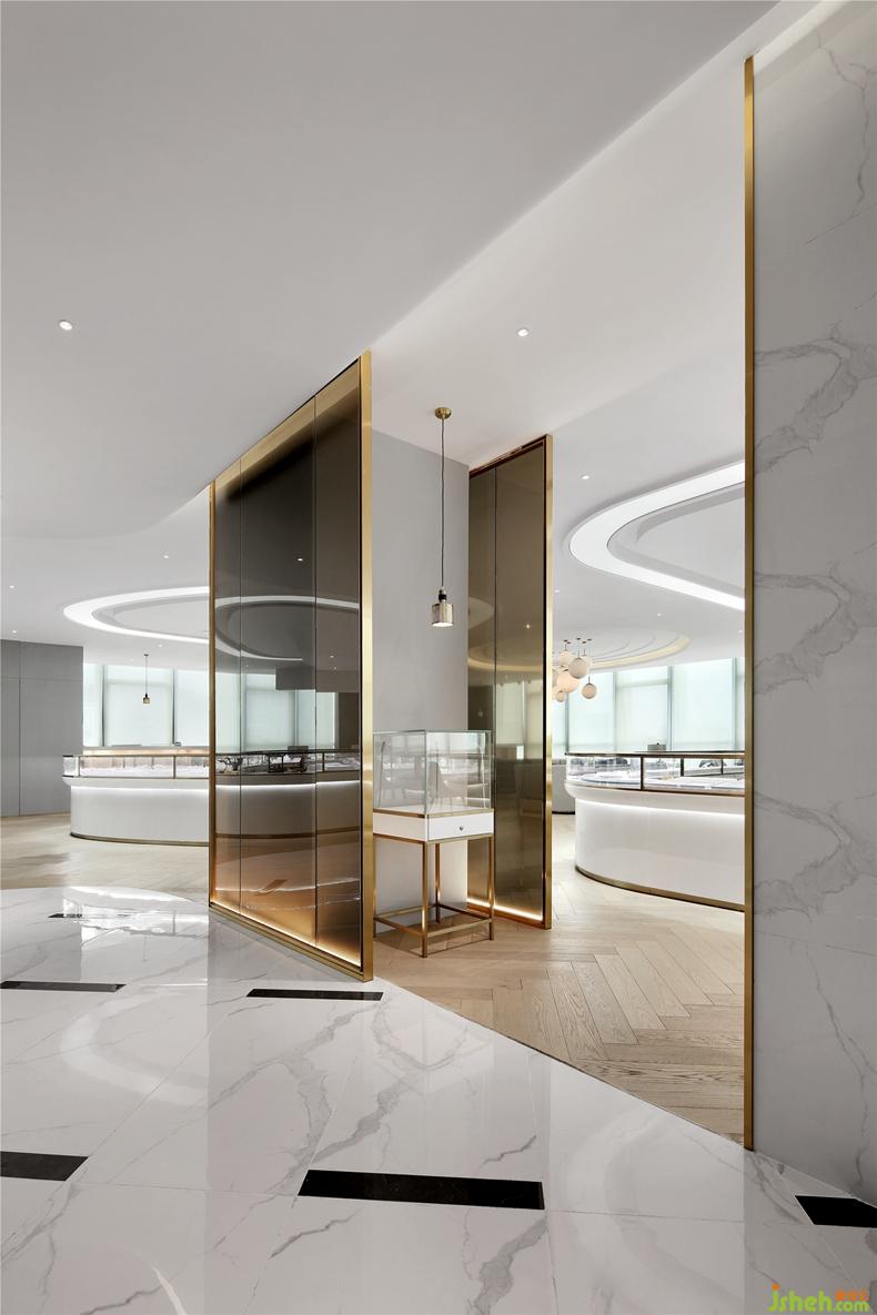 展示區(qū)整體色調(diào)以白色為主,金屬邊框體現(xiàn)質(zhì)感。在柔和的燈光下,一件件精心設(shè)計制作的珠寶作為展示空間里的主角,吸引著消費者全部的視線。