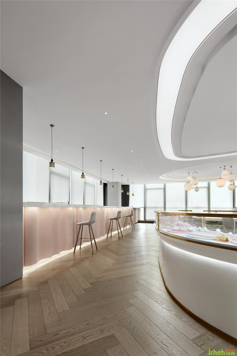本案的珠寶展廳位于水貝銀座珠寶城,兼具展示、接待及辦公功能,室內(nèi)設(shè)計師的靈感來源于寶石的形態(tài)以及女性的柔美,韻律流暢的線條為展廳賦予了前衛(wèi)時尚的格調(diào),同時以不同質(zhì)感純凈的白為空間底色,煙粉、明黃、寶藍等點綴其中,打造夢幻輕奢的氣質(zhì)空間。