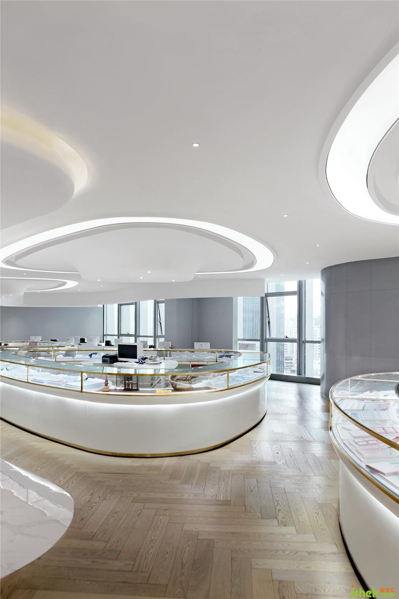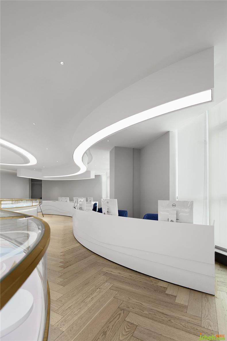 辦公區(qū)以輕薄流動的造型,室內(nèi)設(shè)計(jì)師定制了辦公家具,與燈帶同樣形成呼應(yīng)。從功能動線上來說,工作人員面對展臺的設(shè)計(jì),既便于第一時(shí)間發(fā)現(xiàn)客戶需求,進(jìn)行咨詢與服務(wù),視覺上,流動的曲線也充分體現(xiàn)了美感,并給人輕盈而不沉悶的體驗(yàn)感。