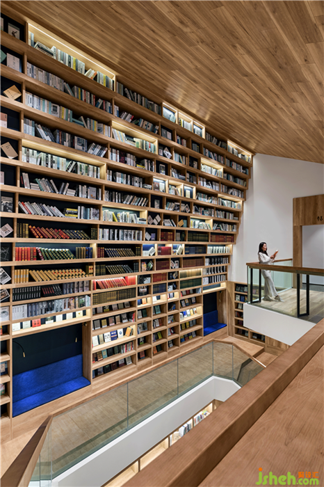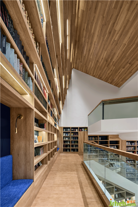 進(jìn)入挑空核心區(qū),兩層高的書架成為統(tǒng)治性元素,定義了場所主題和精神,抬升了空間的軒敞氣度,樓梯處理集成了書架功能包圍感十足,讓人沉浸在一片書的海洋之中。室內(nèi)設(shè)計(jì)師