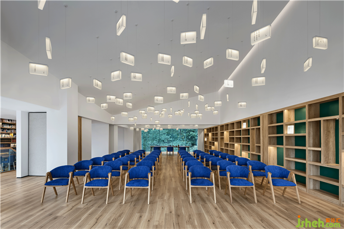 在一個不對稱的異形頂棚下,吊掛懸浮的書本的裝置藝術(shù),飄在空中形成舞動的陣列,靈感飛升在天際,如同美夢或者童話里的場景,不可觸及而又如此真實不虛。點綴性的藍綠色搭拉開顏色張力,讓空間變得沉靜淡然。室內(nèi)設(shè)計師