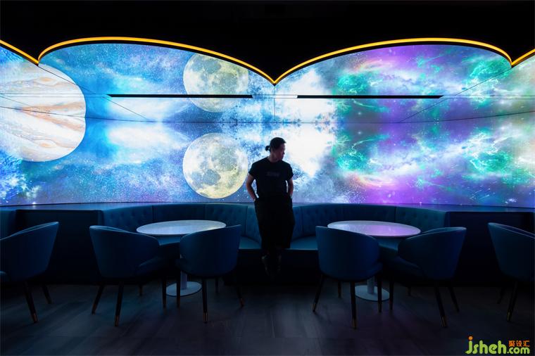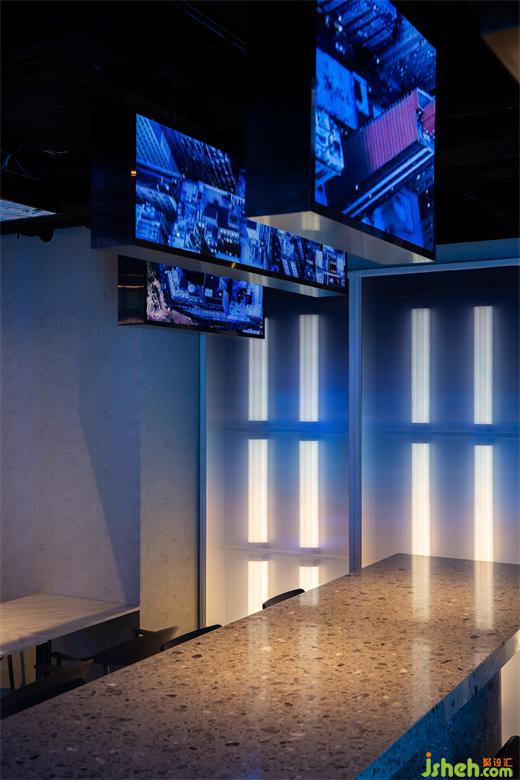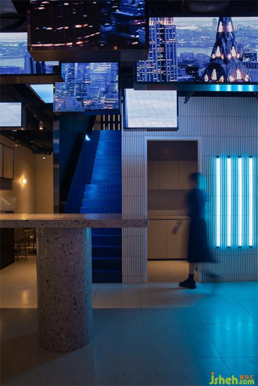在這個125㎡的空間中,設計師運用玻璃、立體磚、燈管、LED電子屏等多元物料進行對比,酒吧設計構建出豐富的空間層次,讓消費者可以體驗一種交感幻象,以此回應賽博空間的復雜性。