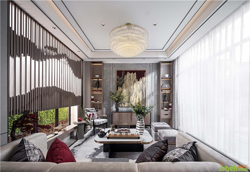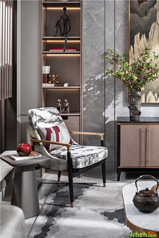 客廳的設(shè)計(jì)帶出細(xì)膩的新東方顯學(xué), 山水不以墨色顯暮色金碧訴情衷,以現(xiàn)代手法布局空間。山水相逢,墨色入織,壁面上華麗用色的山水畫(huà),應(yīng)和單椅上的水墨質(zhì)感。雙窗對(duì)應(yīng),大景開(kāi)闊雙關(guān),一面以簾幕帶出透光,另一面以不規(guī)則格柵裝置劃出幾何山水,將尊貴的迎賓空間,以現(xiàn)代骨干構(gòu)筑合宜呈現(xiàn)。別墅裝飾