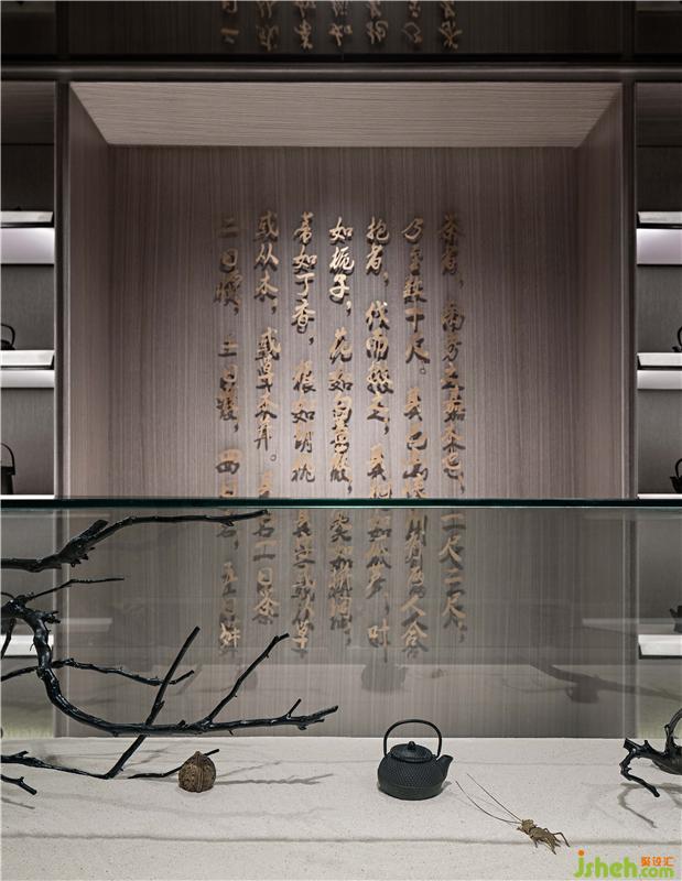 "茶者,南方之嘉木也。" 茶室形象牆上,以唐代陸羽的"茶經"詞句,帶出展示間主題。透亮光彩的茶室形象展示間,蒐藏展示業(yè)主多年精心的茶壺蒐集,有各式材質,玲瓏剔透的藝術精品,展現屬于東方茶道文化的風采??臻g以亮度映射天花板鏡面,放亮空間色澤照明。層板片內坎燈源為大空間帶來光澤序列,提升展示物的細膩與質感。別墅裝飾