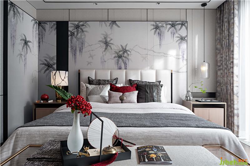 主臥著重于日常間,淺酌盎然回應春意陽光,體現高質感生活細節(jié),于空間每一處,綻放自然明媚的光澤。設計師以明亮調性回應業(yè)主喜好,延續(xù)一貫的東方工筆花草于臥室背景墻,主視覺提升猶如春天般新意。天花設計以白色層次勾勒黑框線,更顯有時尚范的立體層次。別墅裝飾